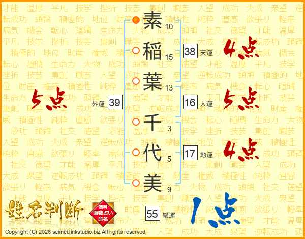 素(10画)稲(15画)葉(13画) 千(3画)代(5画)美(9画)