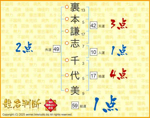 裏(13画)本(5画)謙(17画)志(7画) 千(3画)代(5画)美(9画)