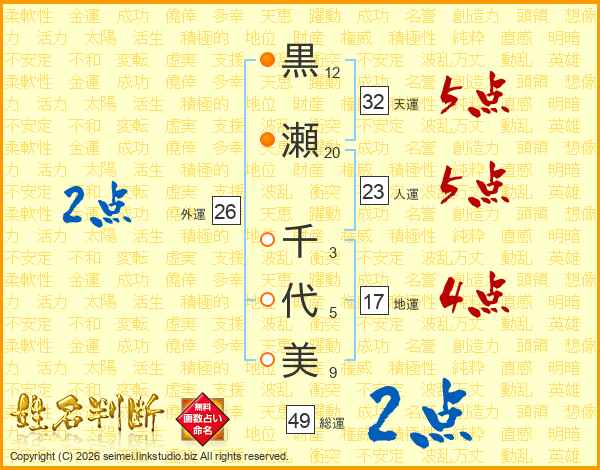 黒(12画)瀬(20画) 千(3画)代(5画)美(9画)