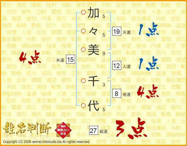 加(5画)々(5画)美(9画) 千(3画)代(5画)