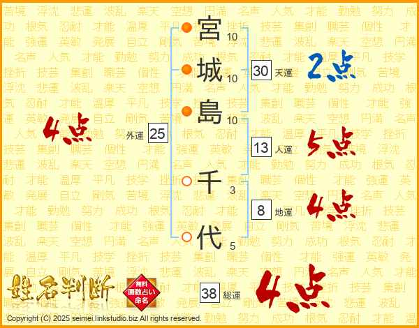 宮(10画)城(10画)島(10画) 千(3画)代(5画)