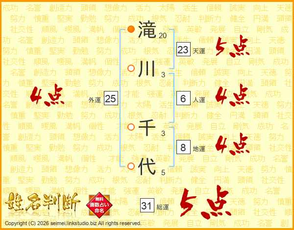 生活面を象徴する運勢です。外部から受ける影響力を表し、結婚運、家庭運や職場、環境への順応性を表します。総運から人運を引いた画数。姓や名が1文字の場合を除く。