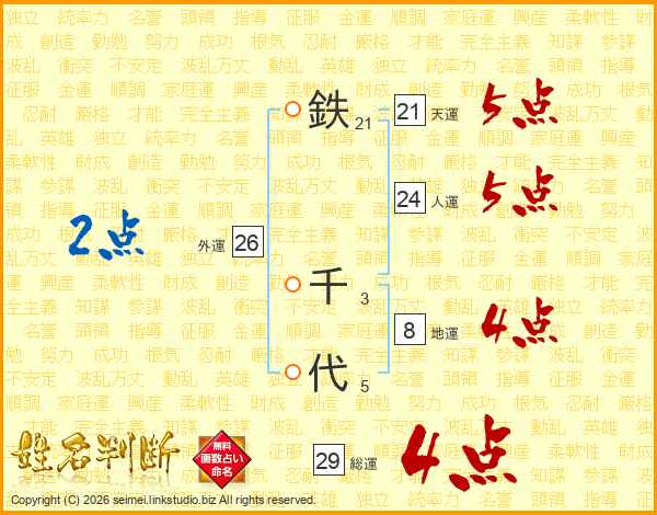 あなたの人生を表す1番重要な運勢です。生涯を通じて影響する総合運となり、主に50歳以降の晩年期に影響を及ぼします。苗字と名前の合計画数。