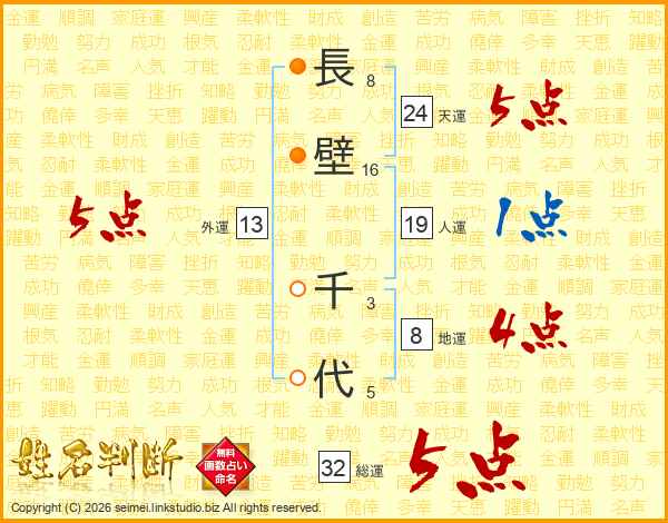 あなたの人生を表す1番重要な運勢です。生涯を通じて影響する総合運となり、主に50歳以降の晩年期に影響を及ぼします。苗字と名前の合計画数。