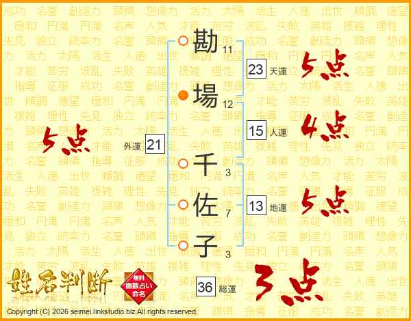 勘(11画)場(12画) 千(3画)佐(7画)子(3画)