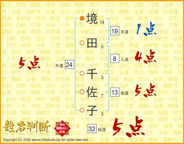 境(14画)田(5画) 千(3画)佐(7画)子(3画)