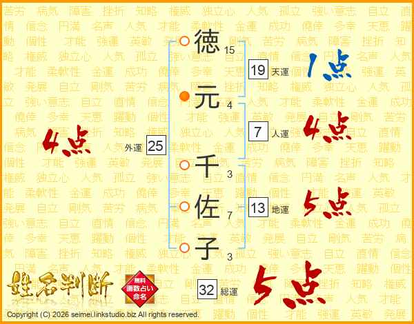 徳(15画)元(4画) 千(3画)佐(7画)子(3画)