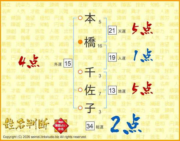 本(5画)橋(16画) 千(3画)佐(7画)子(3画)