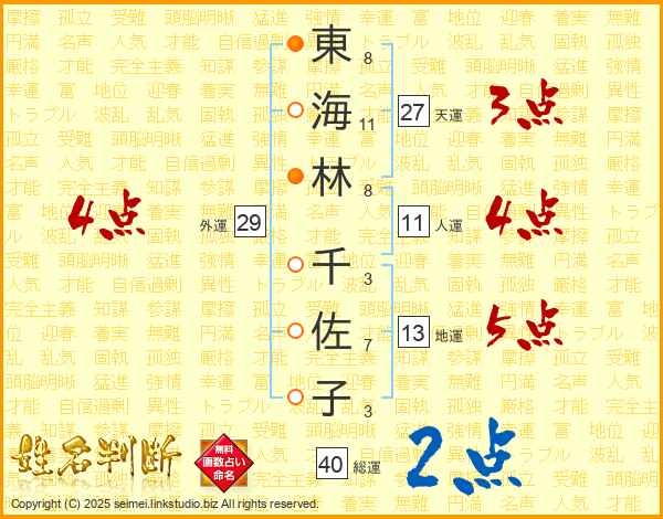 東(8画)海(11画)林(8画) 千(3画)佐(7画)子(3画)