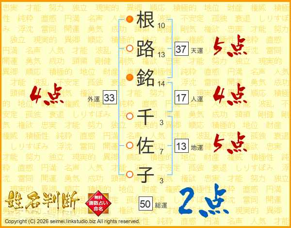根(10画)路(13画)銘(14画) 千(3画)佐(7画)子(3画)
