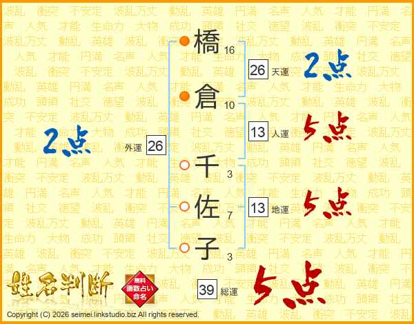 橋倉千佐子さんの総運は39画の5点!