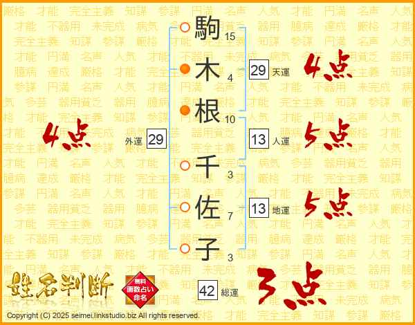 駒(15画)木(4画)根(10画) 千(3画)佐(7画)子(3画)