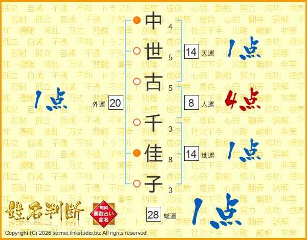 中(4画)世(5画)古(5画) 千(3画)佳(8画)子(3画)