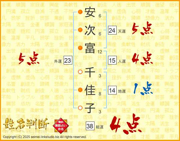 安(6画)次(6画)富(12画) 千(3画)佳(8画)子(3画)