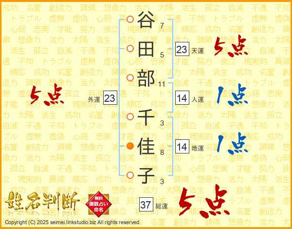 谷(7画)田(5画)部(11画) 千(3画)佳(8画)子(3画)