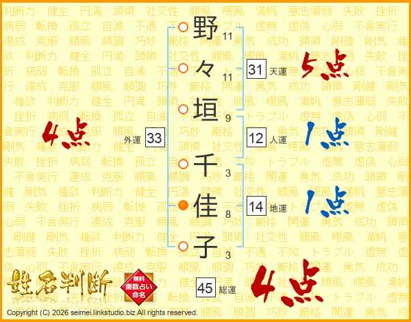 野(11画)々(11画)垣(9画) 千(3画)佳(8画)子(3画)