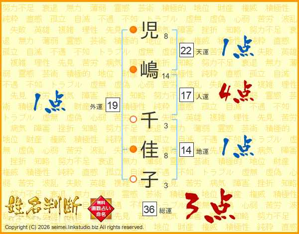 児(8画)嶋(14画) 千(3画)佳(8画)子(3画)