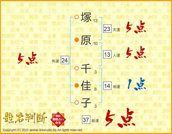 塚(13画)原(10画) 千(3画)佳(8画)子(3画)