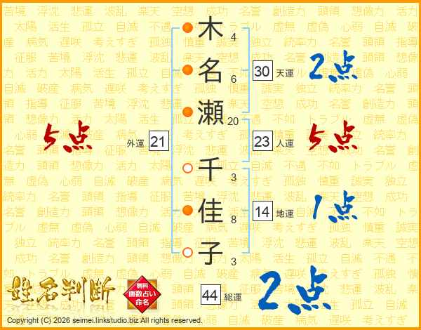 木(4画)名(6画)瀬(20画) 千(3画)佳(8画)子(3画)