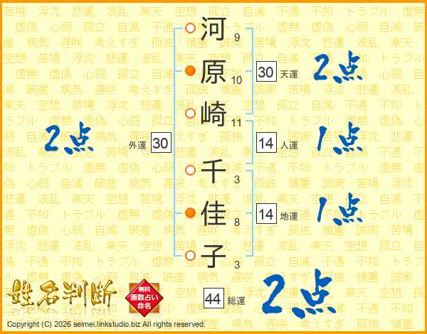 河(9画)原(10画)崎(11画) 千(3画)佳(8画)子(3画)
