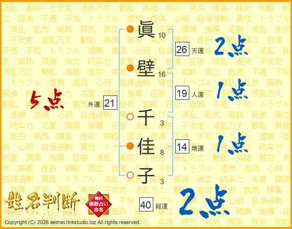 眞(10画)壁(16画) 千(3画)佳(8画)子(3画)