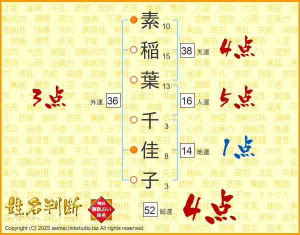 素稲葉千佳子さんの総運は52画の4点!