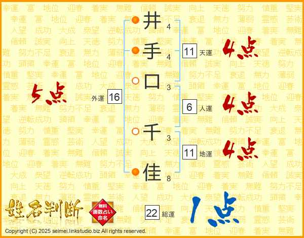 井(4画)手(4画)口(3画) 千(3画)佳(8画)