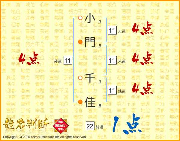 小(3画)門(8画) 千(3画)佳(8画)