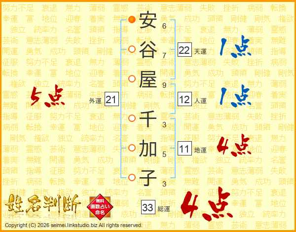 安(6画)谷(7画)屋(9画) 千(3画)加(5画)子(3画)