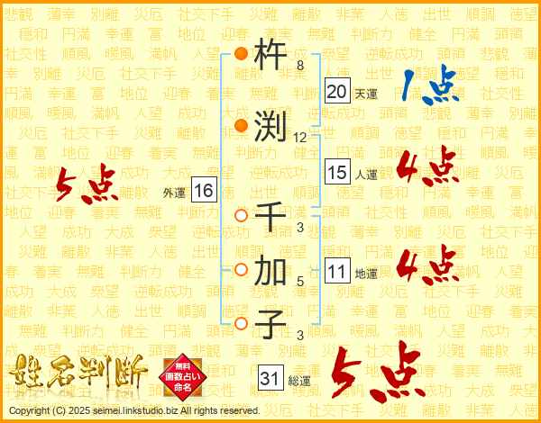 杵(8画)渕(12画) 千(3画)加(5画)子(3画)