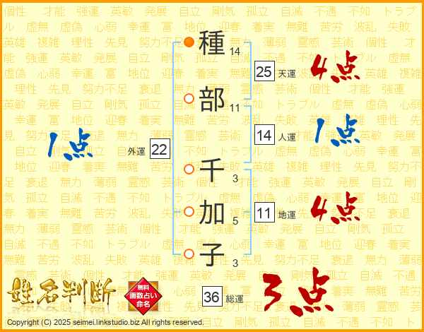 種(14画)部(11画) 千(3画)加(5画)子(3画)