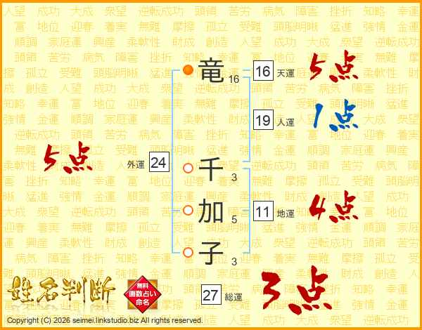 竜(16画) 千(3画)加(5画)子(3画)