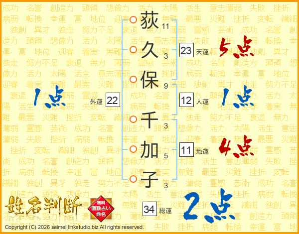 荻(11画)久(3画)保(9画) 千(3画)加(5画)子(3画)