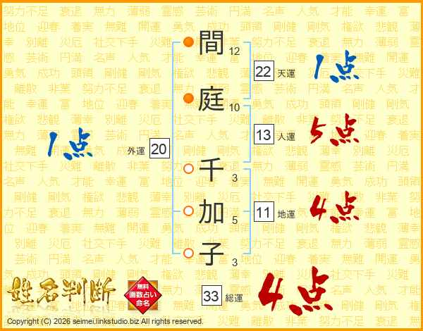 間(12画)庭(10画) 千(3画)加(5画)子(3画)