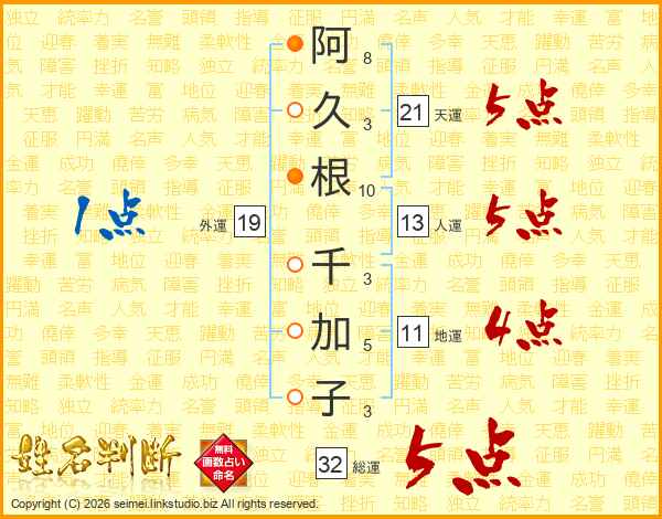 阿(8画)久(3画)根(10画) 千(3画)加(5画)子(3画)