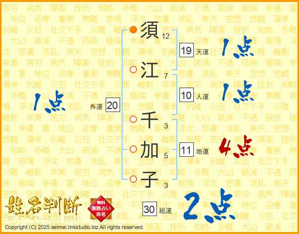 須(12画)江(7画) 千(3画)加(5画)子(3画)