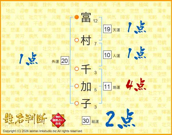富(12画)村(7画) 千(3画)加(5画)子(3画)