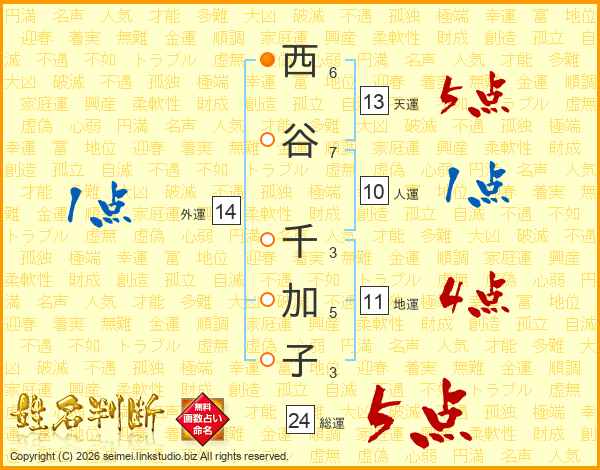 西(6画)谷(7画) 千(3画)加(5画)子(3画)