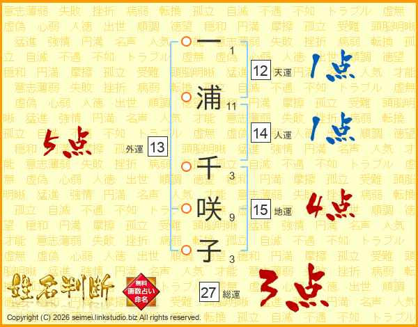 一(1画)浦(11画) 千(3画)咲(9画)子(3画)