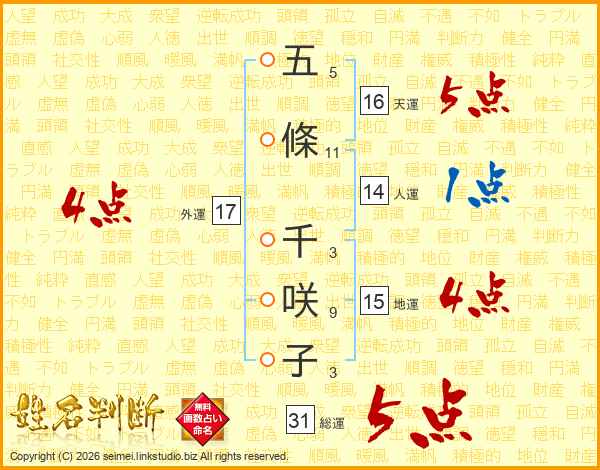 五條千咲子さんの総運は31画の5点!