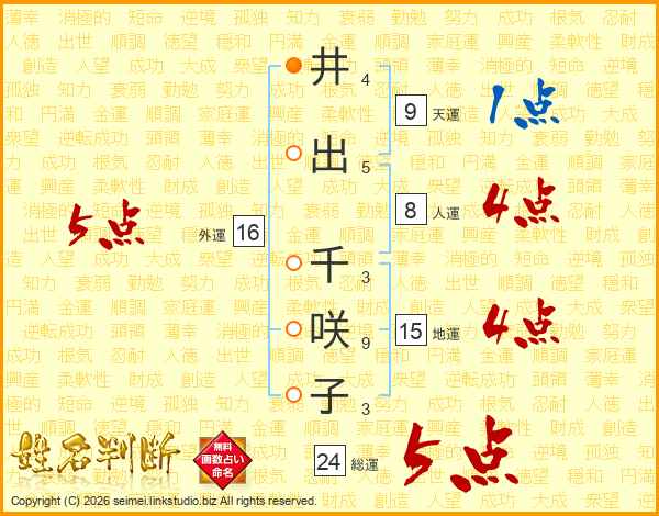 井(4画)出(5画) 千(3画)咲(9画)子(3画)