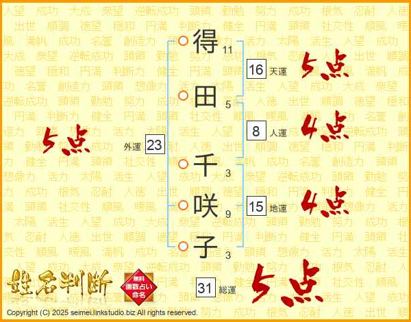 得(11画)田(5画) 千(3画)咲(9画)子(3画)