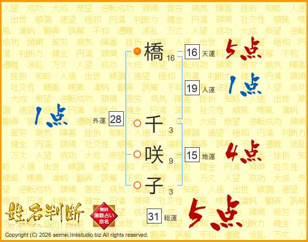 橋千咲子さんの総運は31画の5点!