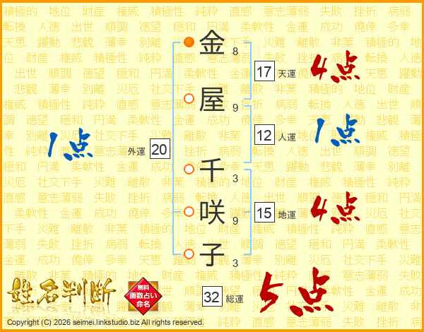 金(8画)屋(9画) 千(3画)咲(9画)子(3画)