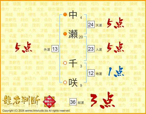 中(4画)瀬(20画) 千(3画)咲(9画)