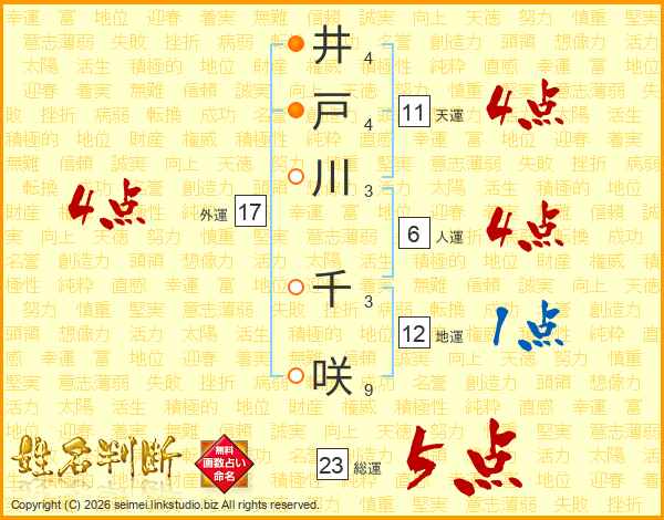 井戸川千咲さんの総運は23画の5点!
