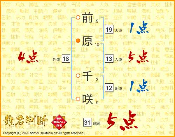 生活面を象徴する運勢です。外部から受ける影響力を表し、結婚運、家庭運や職場、環境への順応性を表します。総運から人運を引いた画数。姓や名が1文字の場合を除く。