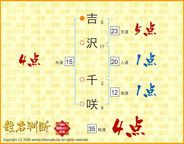 吉(6画)沢(17画) 千(3画)咲(9画)