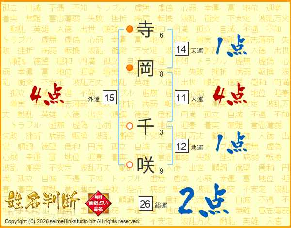 寺(6画)岡(8画) 千(3画)咲(9画)