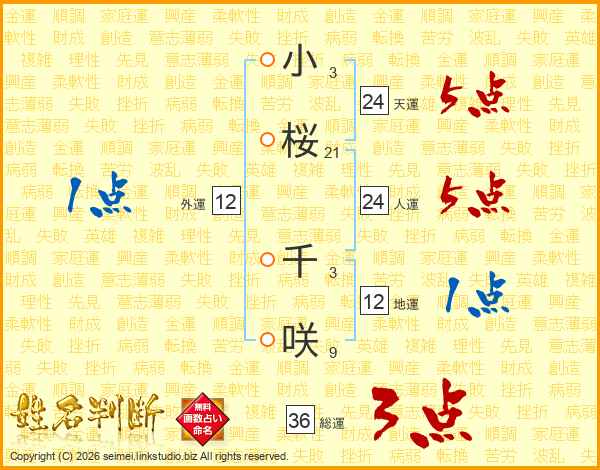 生活面を象徴する運勢です。外部から受ける影響力を表し、結婚運、家庭運や職場、環境への順応性を表します。総運から人運を引いた画数。姓や名が1文字の場合を除く。